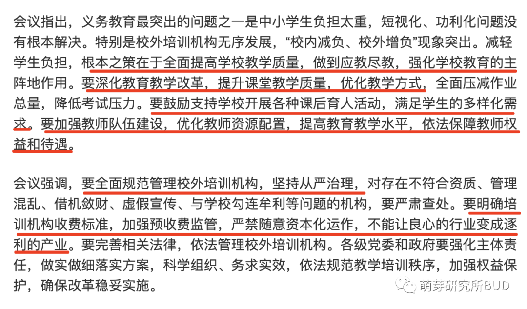 现在来看,国家想要重拳出手的决心是坚定的,并且准备了相当长的时间,但在7月的《意见》全文出来之前,可能大家都没想到,原来5月份审议通过的《意见》可以如此细致、全方面地影响整个行业、学校和家庭,指导力度也是史上最大的。
