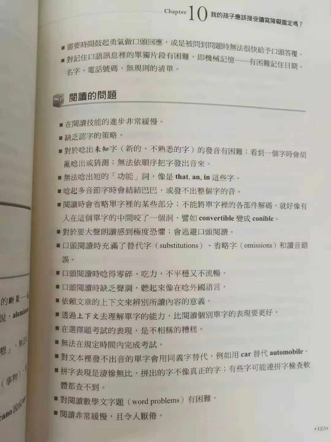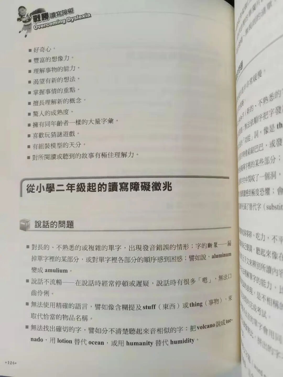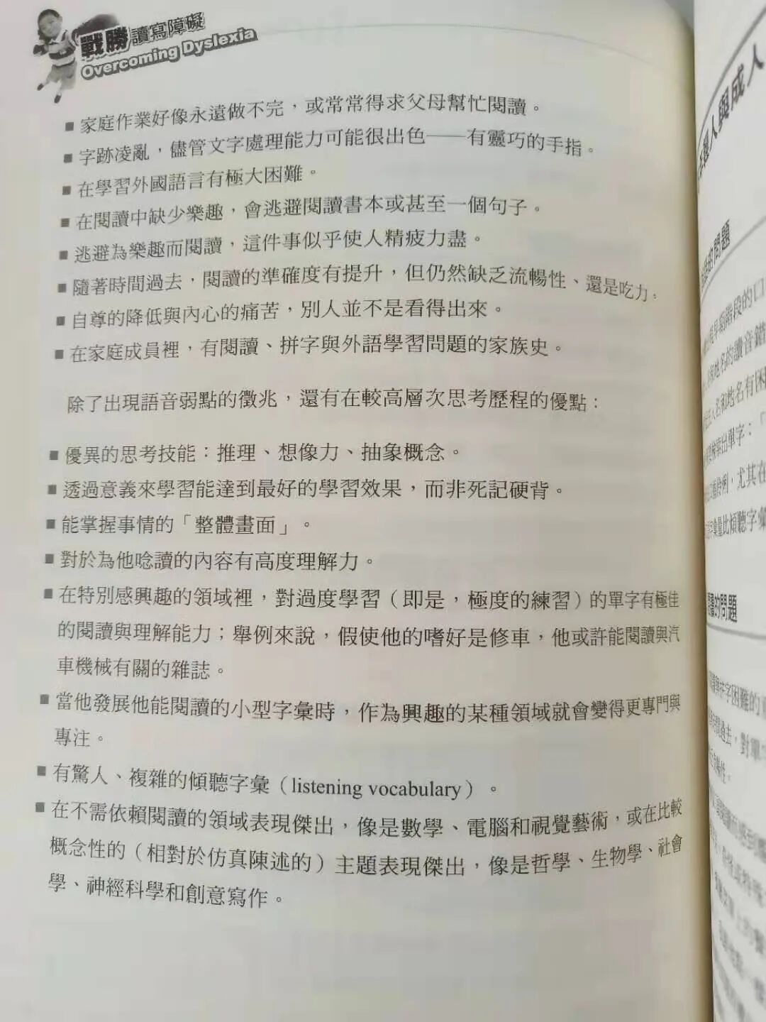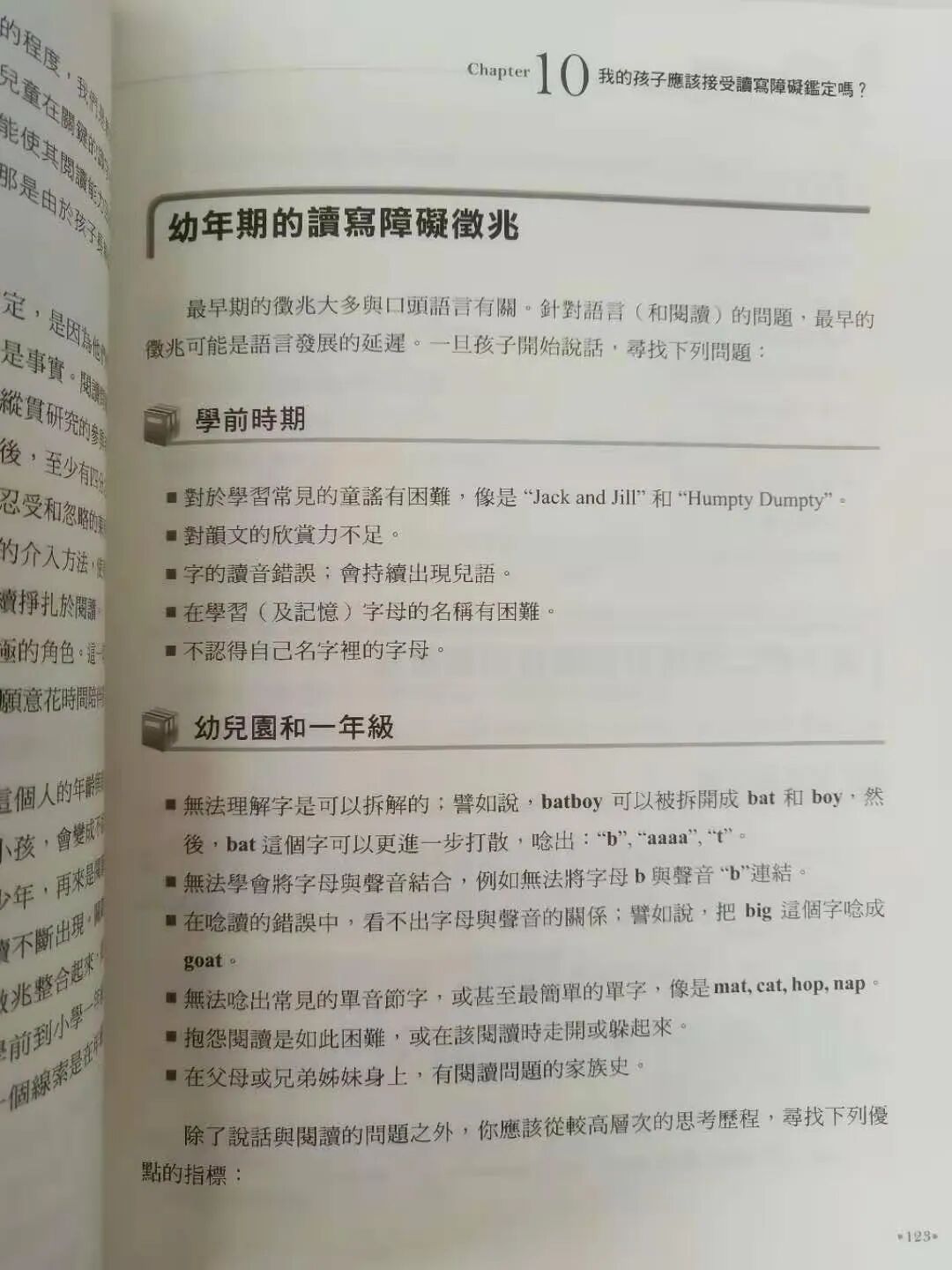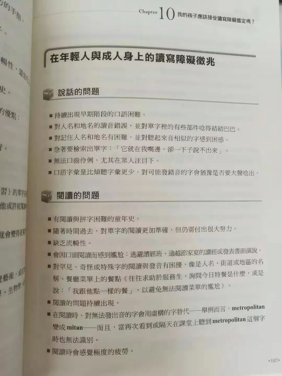 她在书里总结出读写障碍症在学龄前、学龄期、青春期和成年期不同的征兆。我自己好几年前买的是港台版,我把这部分都拍出来了,朋友们可以作为自检也对照看一看。(完整扫描版请于公众号后台,消息框里回复“读写障碍”获取)▼