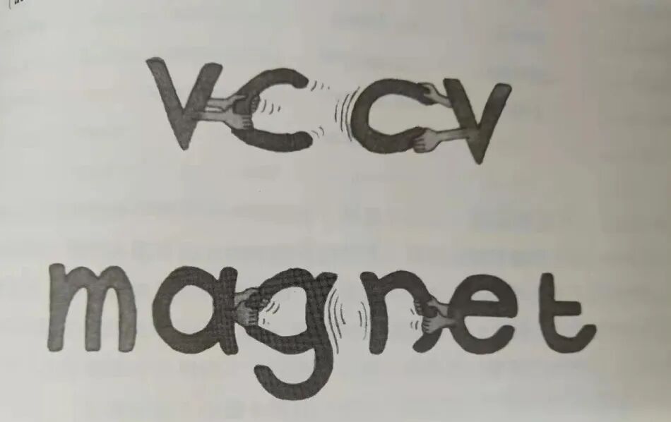其他的如“两个子音被两个母音所包围”,这个策略也不难学。你可以告诉孩子,想象母音们正试着把子音们拉开(如下图)。在练习的时候,可以把这些单字写在卡片上,然后要求孩子准确地显示他会在哪些地方把字分开。