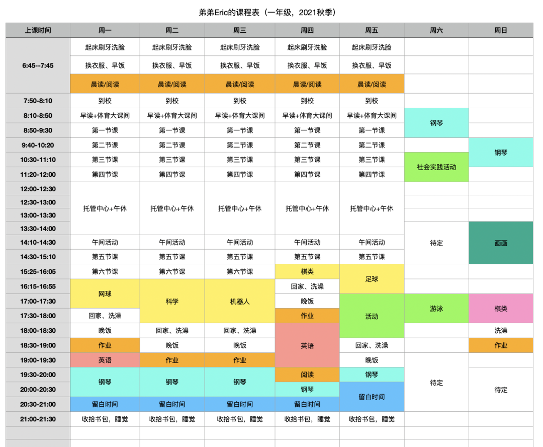 周一早啊,朋友们,我终于排完弟弟的一年级学期课表了!▼