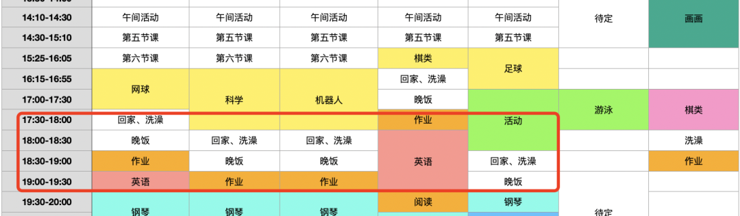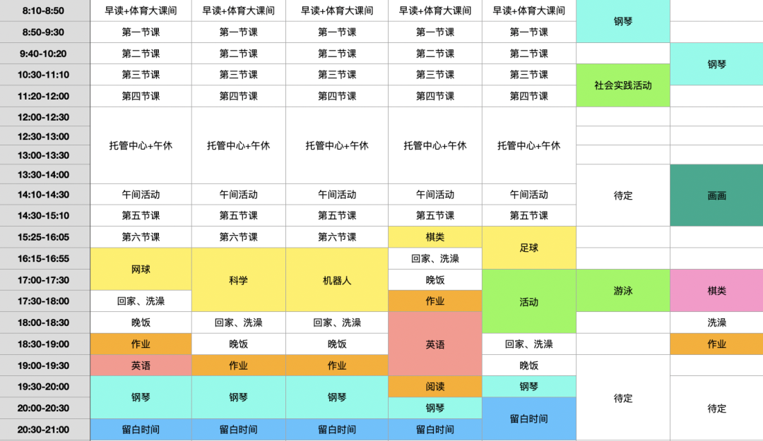 当然,只能是说大致排完,但还没有实践,而且还有些待定的空位,没想好就先不管了。我知道挺多朋友问我孩子的课表如何安排,所以就想借今天的文章跟大家聊一下,我是怎么样看小朋友的课表,以及从课表的规划中我思考了些什么东西。