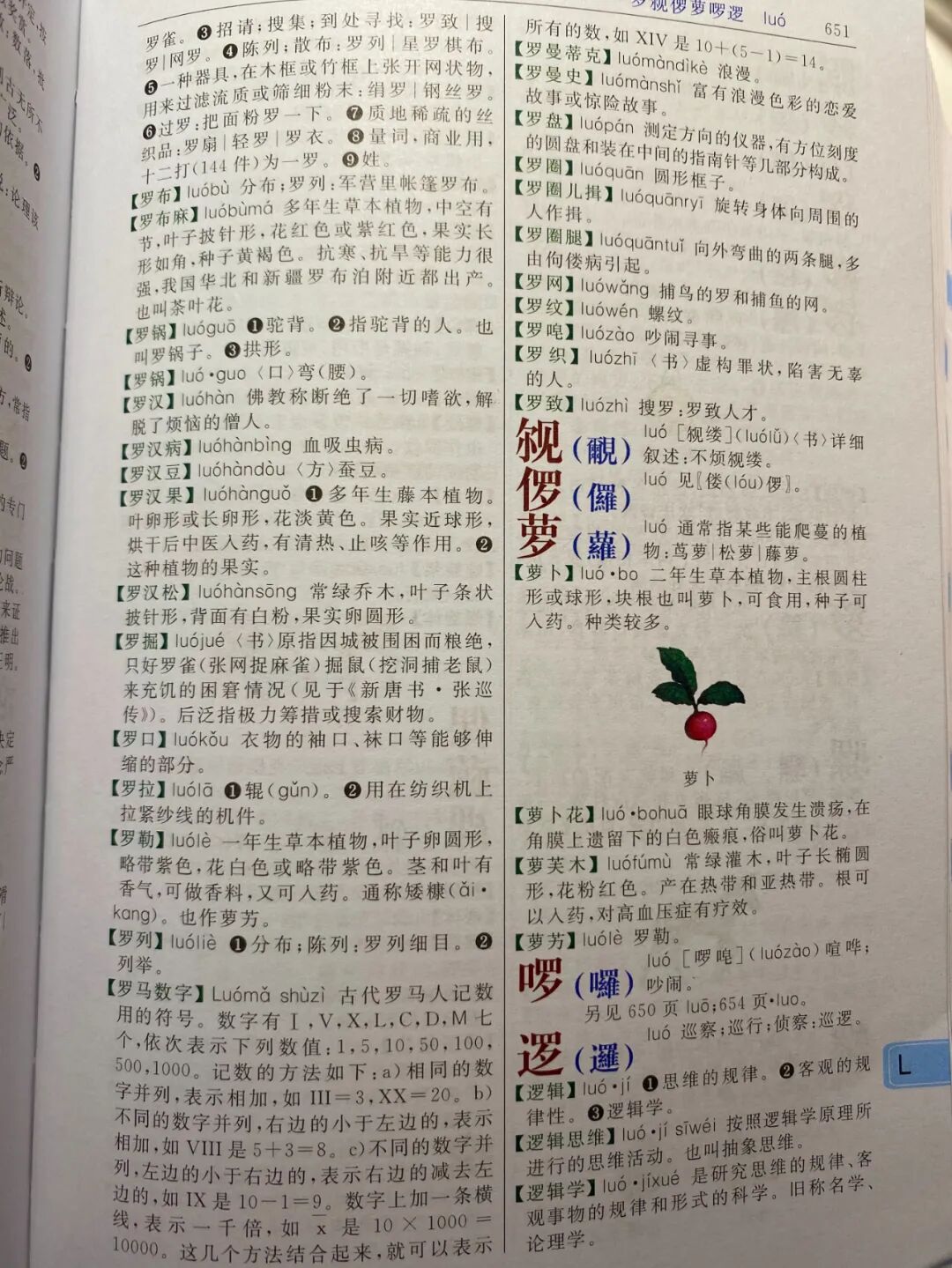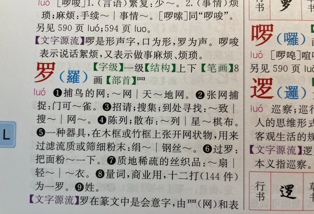 还有当孩子翻看《新华汉语词典》时,发现“罗”可以组那么多词时候,他们就沿着顺序,把所有的词都读了一遍。我内心其实也是窃喜的,因为谁不希望孩子多认字、多学词呀。▼