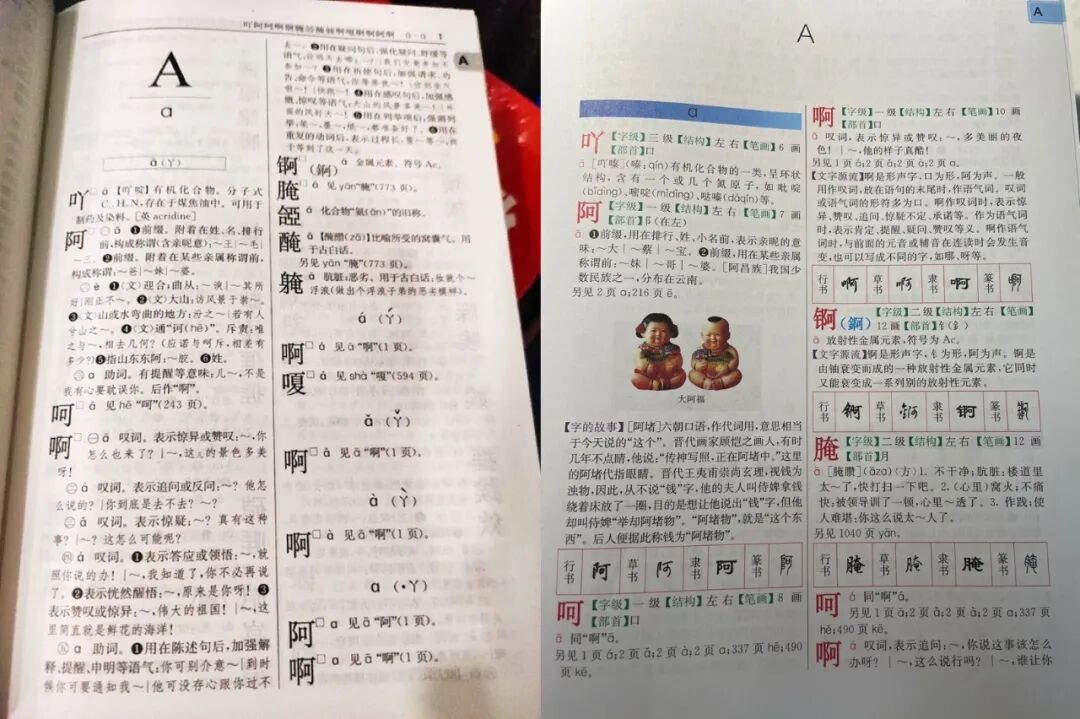 当时为了考虑小孩子的用眼健康、以及对阅读的乐趣培养,我选的《新华大字典》是商务印书馆集团旗下专门针对学生和孩子、老人群体设计的版本,实体对比是这样子的。▼