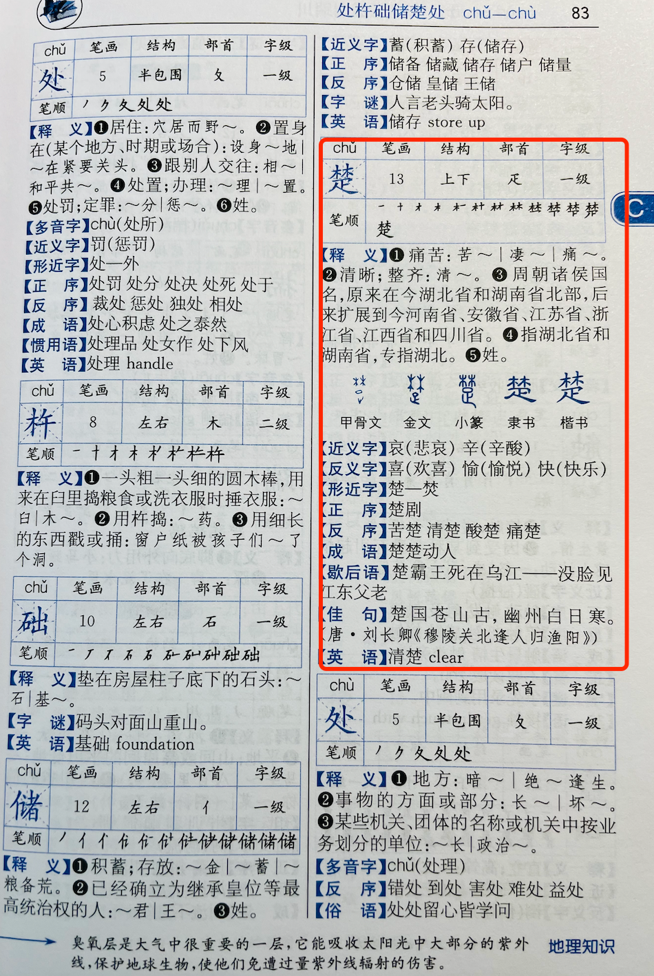 我家孩子也会去翻看,对他们来说,翻看这类工具书,他们的关注点会更聚焦(毕竟信息量没有《新华大字典》那么大),比如孩子能够更细致地看到笔顺、结构、释义、组词、近义词、歇后语、惯用词等一系列知识内容,可以类比为思维导图。孩子一目了然,熟记于心。▼