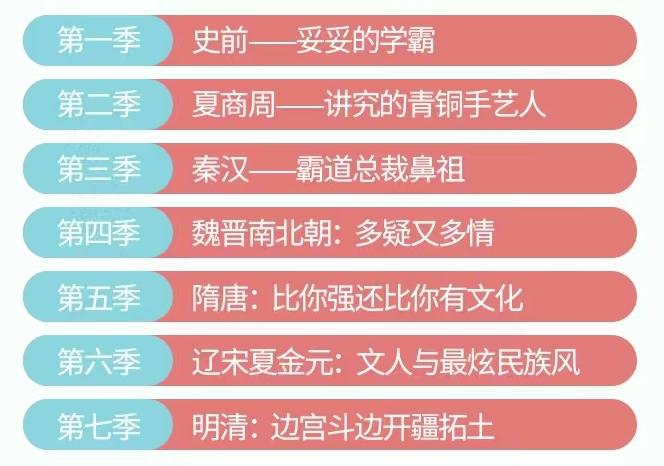 这个系列课程涉及的历史知识比较全面,从第一季的史前讲到第七季的明清,每个时期都有涉及,其间有机融合了历朝历代的人文风俗,衣食住行、名人轶事、重大事件等。而且它的课程素材来源于全国各地的博物馆,孩子在了解历史的同时也能自由穿梭于各博物馆及其经典藏品之间。