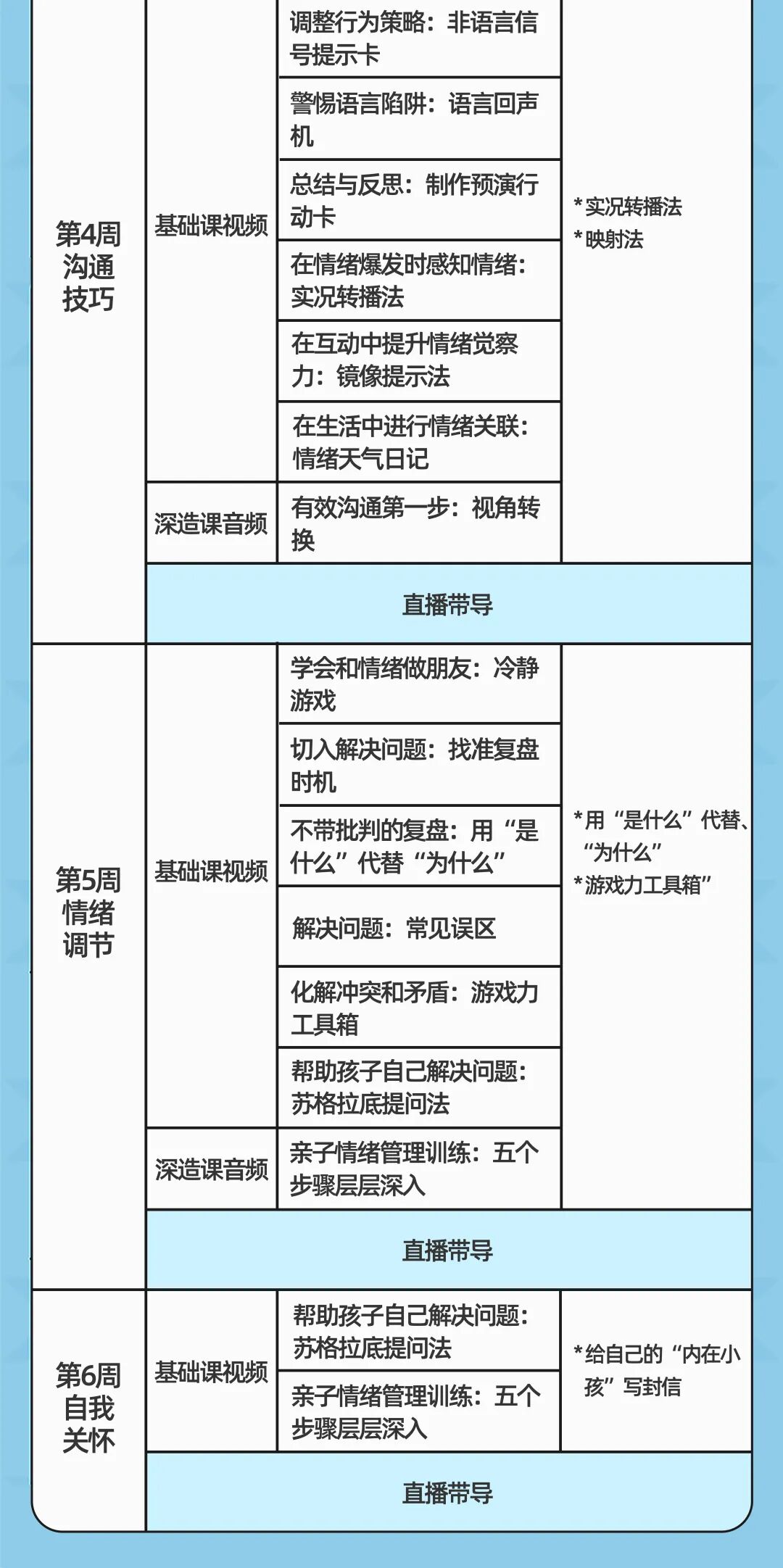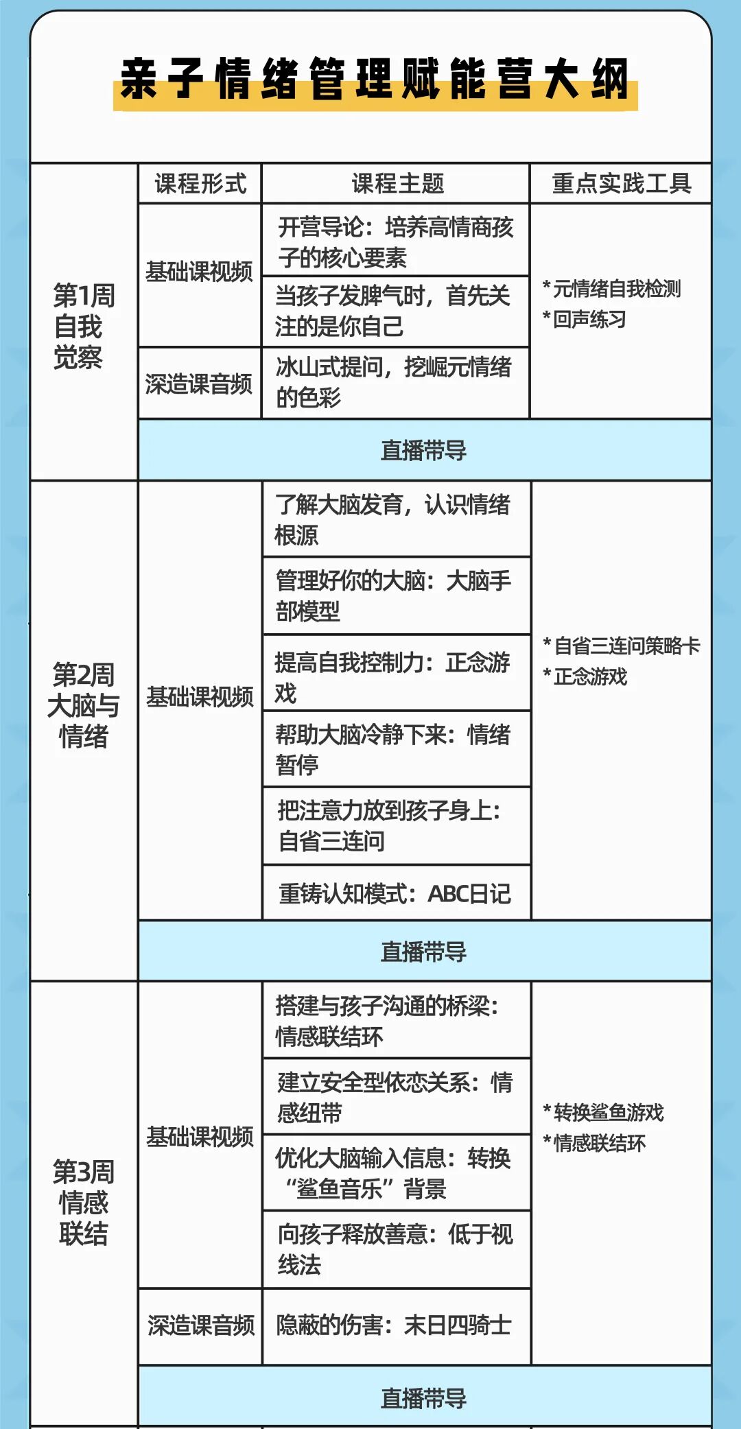 课程以6周社群互助共修为基础,包含30节音频视频课,教给大家30个亲子情绪管理工具和相关的知识点,6次的私密直播课,1整套亲子情绪管理原创实体教材,还加赠5集给孩子看的正念游戏视频课。给大家看下平台课程的大纲: