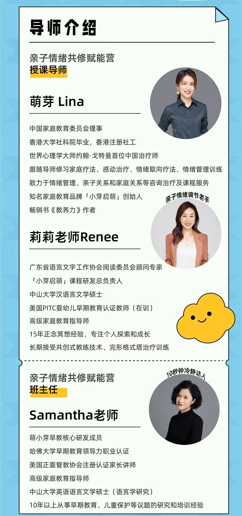 相信大家可以看得出来,我们的情绪营绝非市面上普通和“速成”的线上课,需要大家做好一个为期6周甚至是更长时间的学习准备。我们和首期毕业的学员都“说好了,不散群”,因为情绪的课题,最需要的就是修炼氛围和长期练习,而不是一个人的孤军奋战!在这个新的“情绪共修场”里,你将和三位专业导师、更多同频爸妈们一起,共同修行这个人生的课题!