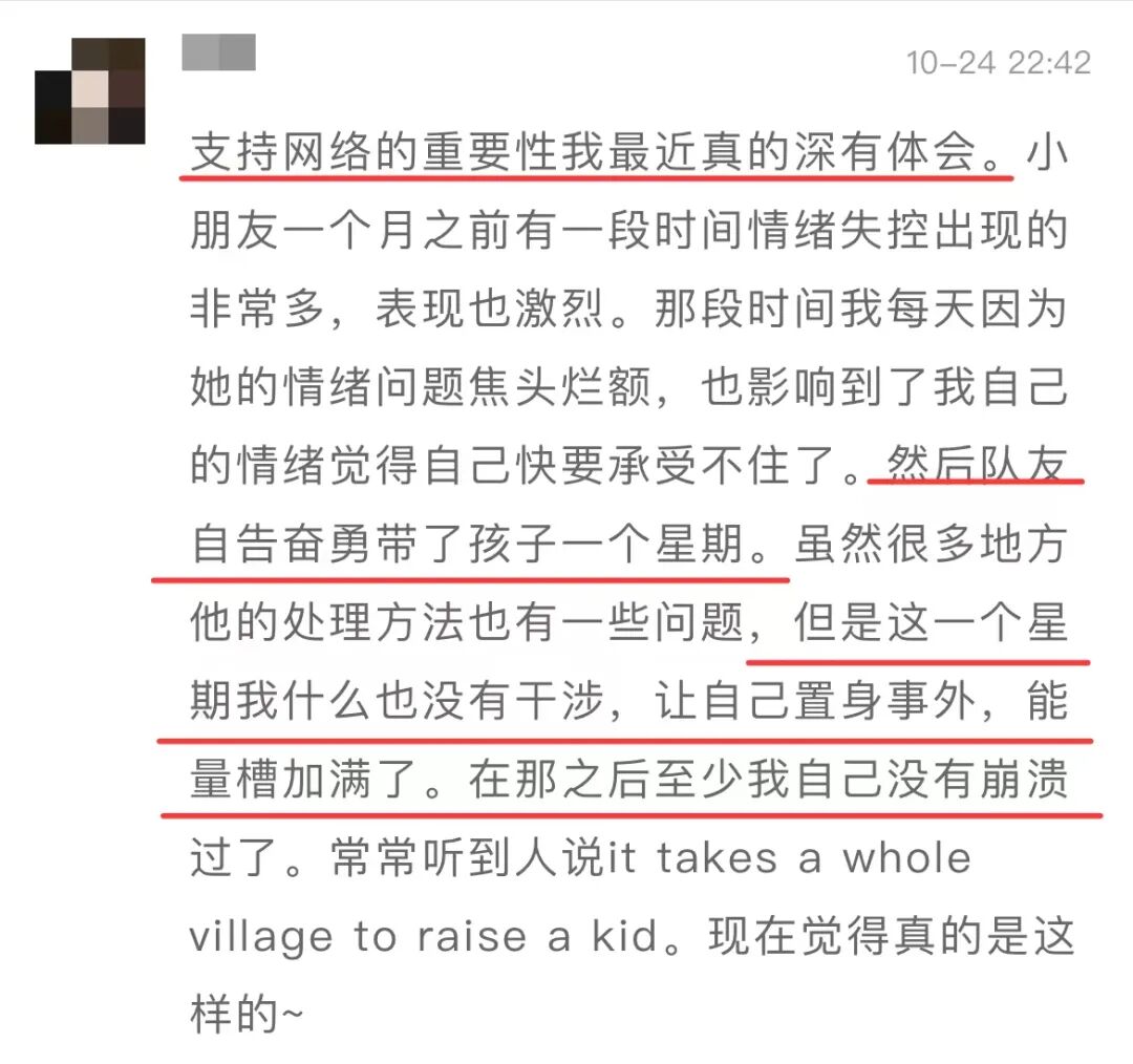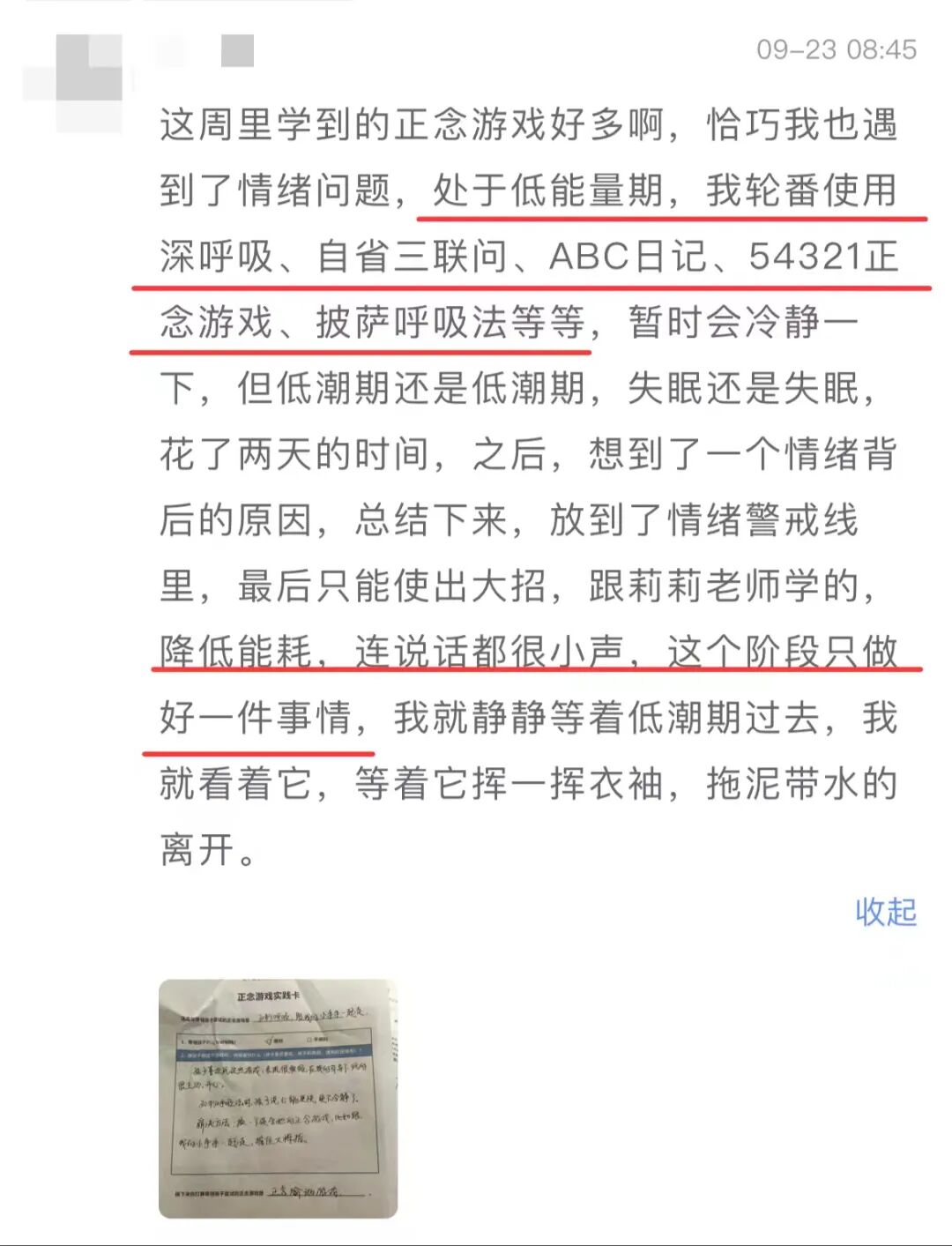 在第一期「亲子情绪管理赋能营」里,大家用学到的方法去不断扩容自己的“情绪耐受窗”,在社群里也分享各自觉得有效的招数,这些点滴积累,就成为了每个妈妈自我赋能的方式,当能量槽满满的,孩子的情绪自然也被我们看到、理解和接纳了。