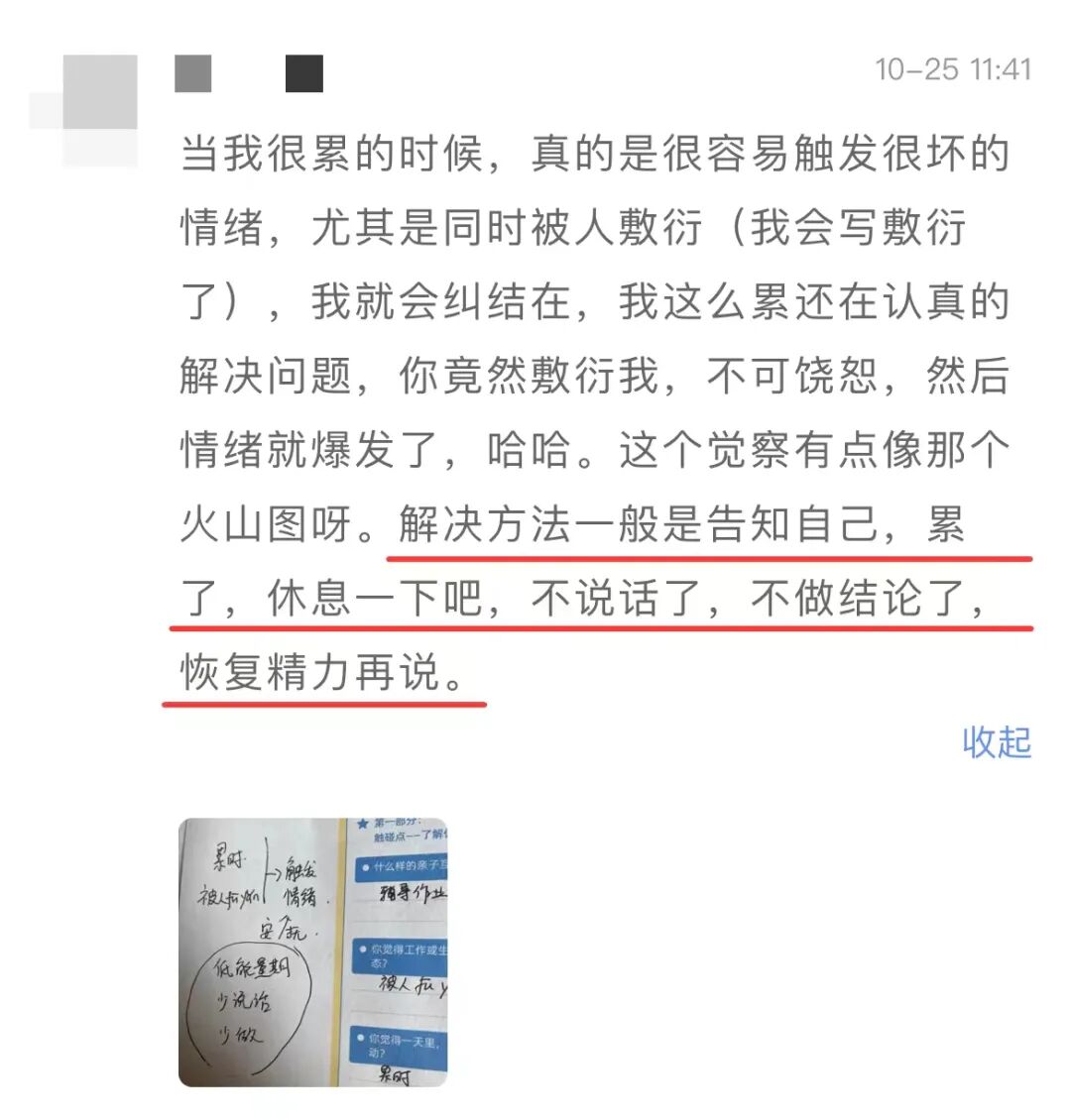 「亲子情绪管理赋能营」就像一个能量补给站,30个情绪工具当中,也有1/3是留给父母自己的情绪调节的,还有8周的社群陪伴,你可以把它看作是临时的支持系统,当情绪不可遏制地爆发了,或是感到身心疲累的时候,来这里充电和倾诉,重新造血。慢慢地你就能掌握要领,自己知道如何回血了。