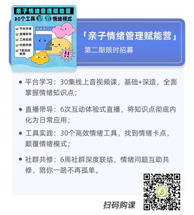 我们第二期「亲子情绪管理赋能营」正在限时招募,11月27-28日创建社群,11月29日正式开营。为期六周的训练营课程,涉及到家长自身、孩子的情绪管理,以及如何建立好的亲子关系,给父母和孩子双向赋能。