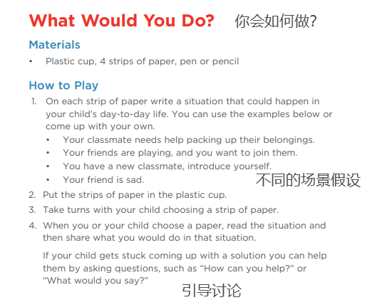这个练习,是设定了一些在家中、学校,可能会发生的一些场景,向孩子提出问题“遇到这样的问题,你会怎么做”。孩子的陈述如果遇到问题,我们可以通过向孩子发问的方式去帮助他们。这样的讨论,可以帮助孩子跳出情绪泥坑,更明白到在平静的情绪下,应该如何去处理问题。