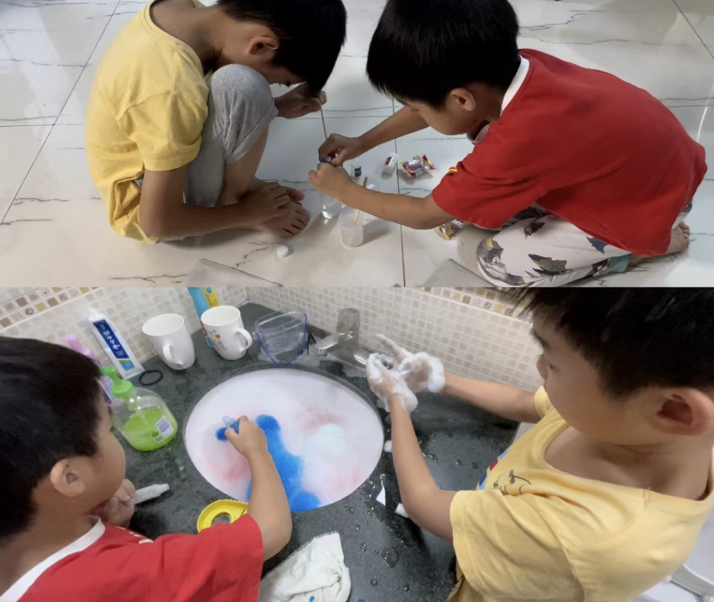 但弟弟喜欢社交互动的学习方式,他很喜欢在玩中学、游戏中学、做实验学、互动(比如讲故事)中学,连做数学题,用教具辅助来学,都比刷题对他有效。所以我就花更多时间陪他,引导他打开自己的思路,在兴奋状态下也能找到专注的方向。