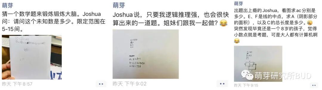 所以我觉得Joshua成长中对数学的进步速度很快,很大一部分原因是他习惯分享自己的思维方式,会主动告诉我们,他是怎么看这道题,是怎么解答,妈妈你看我这个思路怎么样。当他会主动告诉我时,我就会跟他纯粹地交流,哪个地方挺有意思我都没想到,哪个地方我是怎么看的,你怎么想,你觉得这些规律是什么。这样子的讨论我们都是在各种碎片化时间里完成,但我能深刻感受到孩子的进步又快又全面。