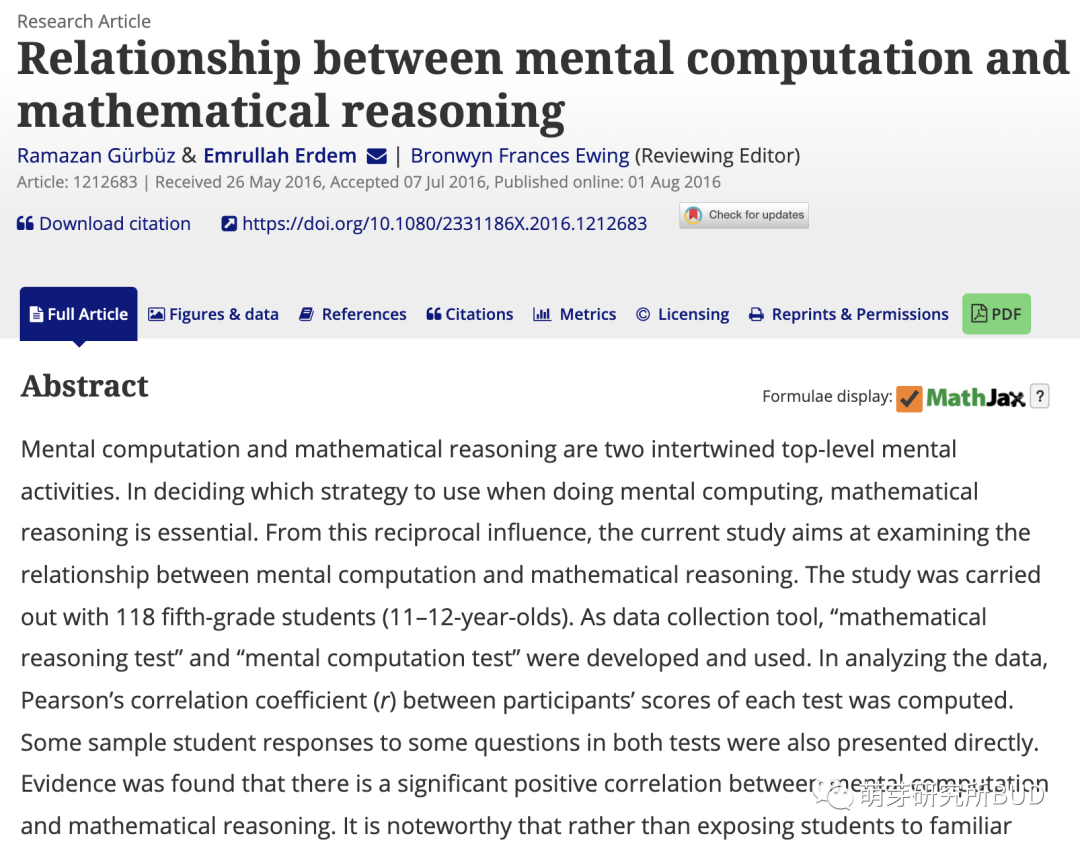 很多研究都支持心算能力对孩子数学能力的有效提高。比如下面这个研究表示,在对118名5年级学生进行的研究中,探讨心算和数学推理之间的关系,研究证据得出:心算和数学推理之间存在显著的正相关性。值得注意的是,鼓励孩子掌握心算,可以提高孩子处理特殊/非常规问题的能力。