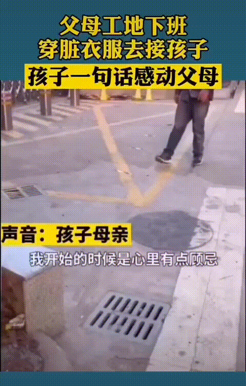 一对在工地上班的父母,下班后穿着满是灰尘的脏衣服去接孩子。他们一开始还有些顾虑,怕孩子会被同学笑话。