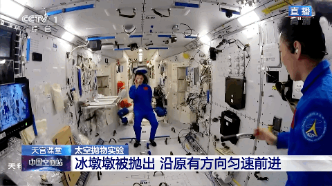 但在空间站失重的环境下,抛出的物体(冰墩墩)遵守牛顿第一定律,沿着直线匀速“飞行”。