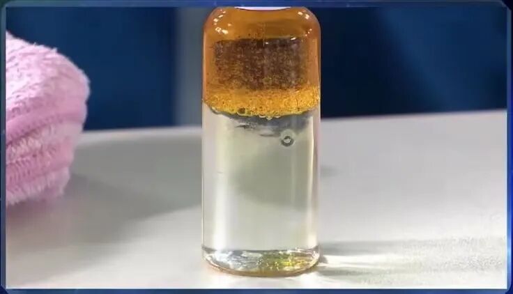 但王亚平手中装着水和油的小瓶子,里面却是混合的状态,并没有分层。