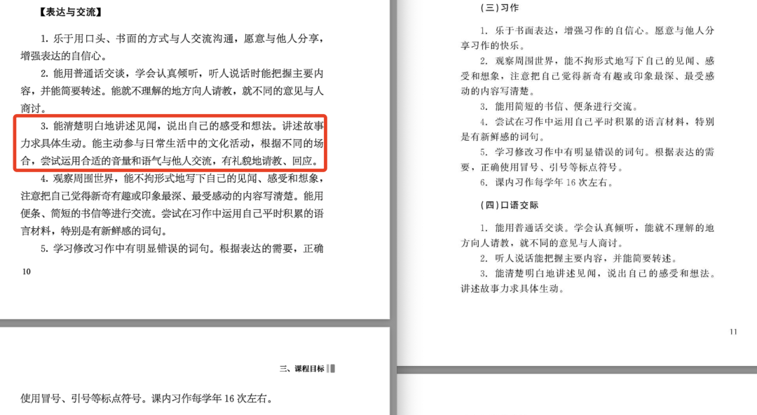 对比2011年的课改,除了把“习作”和“口语交际”合并为“表达与交流”之外,还强调了对学生表达能力的要求,鼓励孩子清楚明白讲述见闻,说自己的感受和想法。