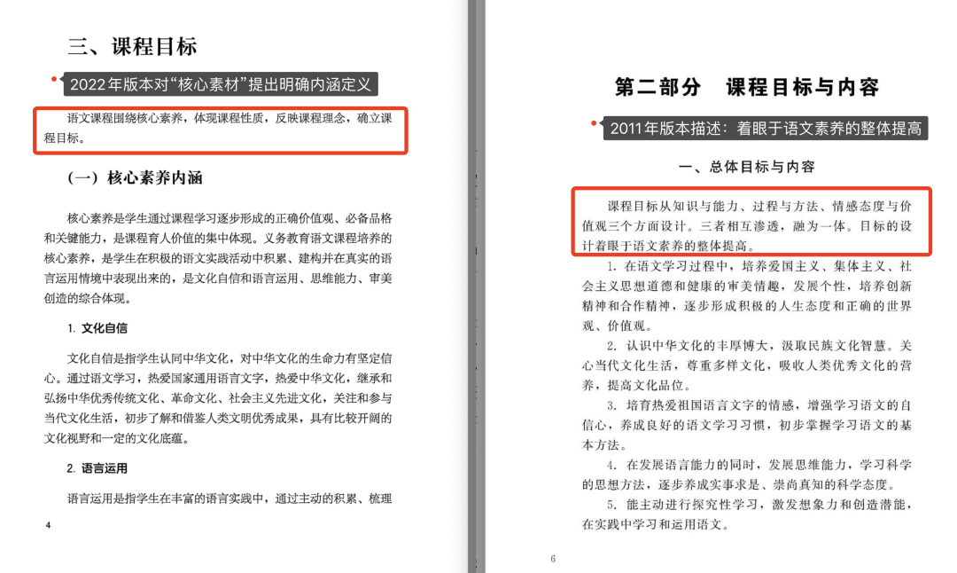 在2011年的版本里,语文素养的讨论已经开展,但当时还并没有作出明确的解说,当时也有声音是提议在“语文素养”里再确定“一个核心”,经过多年发展,在2022年的版本中,已经可以清晰看到这层内涵。