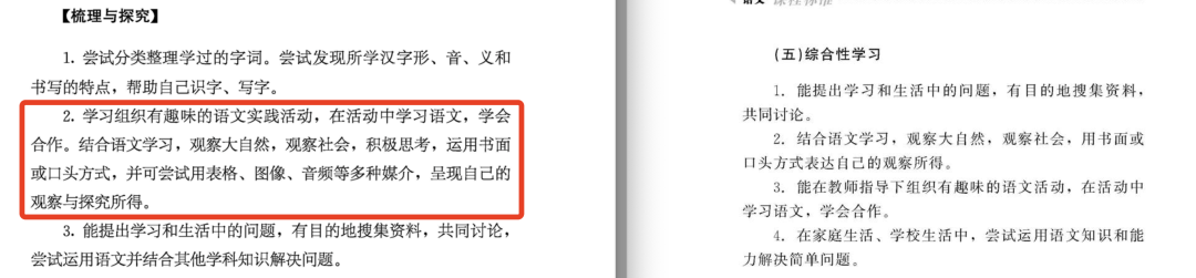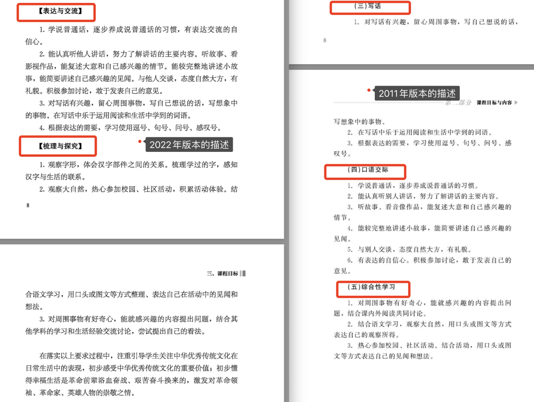 在2011年版本的“写话”、“口语交流”和“综合性学习”,在2022年版本已经合并并升级为“表达与交流”“梳理与探究”这两部分的描述,意味着对这些教学方式背后的内涵要求,进行了更加明确的梳理。