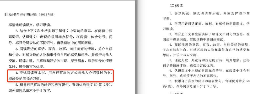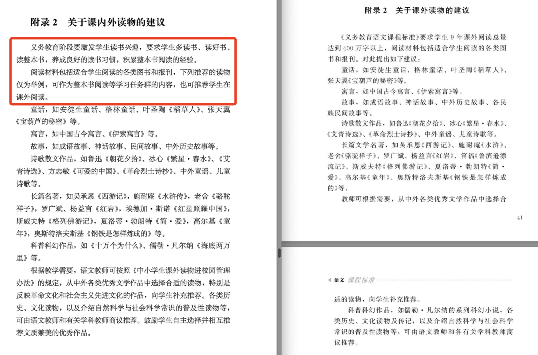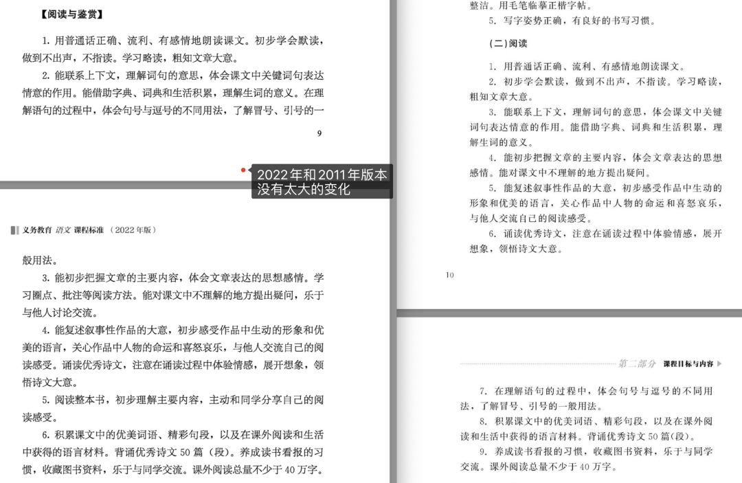 整体来说,仔细对比完2011年的课改,和2022年的课改,我的感受是这十年的大变化并没有,至少在推荐书目和大的标准、功能性的要求是一致的。
