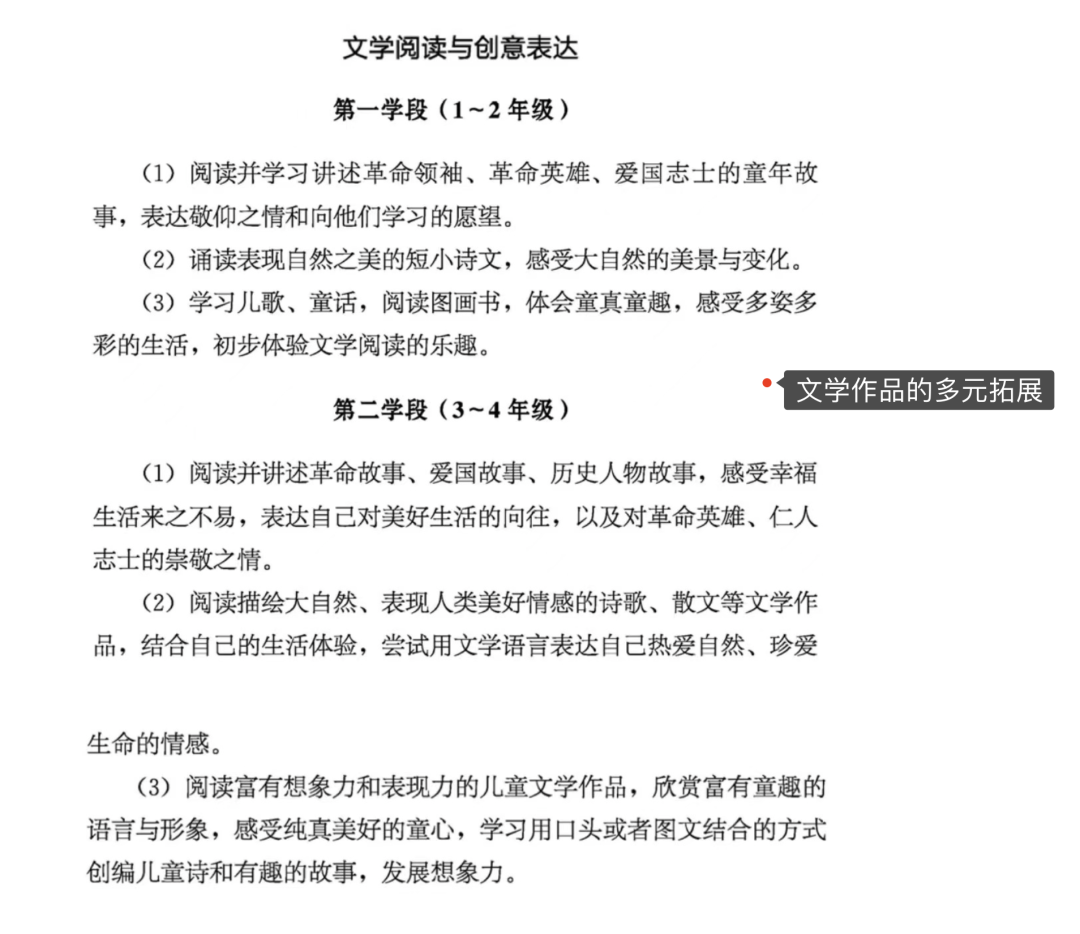 至于其他的要求,比如低学段的背诵范围、课外阅读积累总量,都没有改变,和2011年的标准一样。
