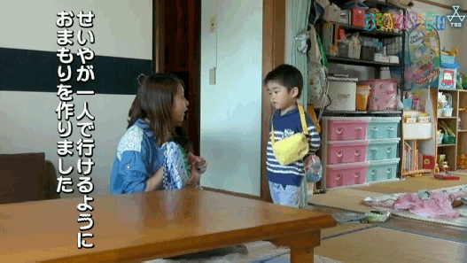 出发前,为了给孩子打气,妈妈拿出亲手缝的护身符,上面有晴矢的专属保护符——帅帅的!晴矢看到非常开心。