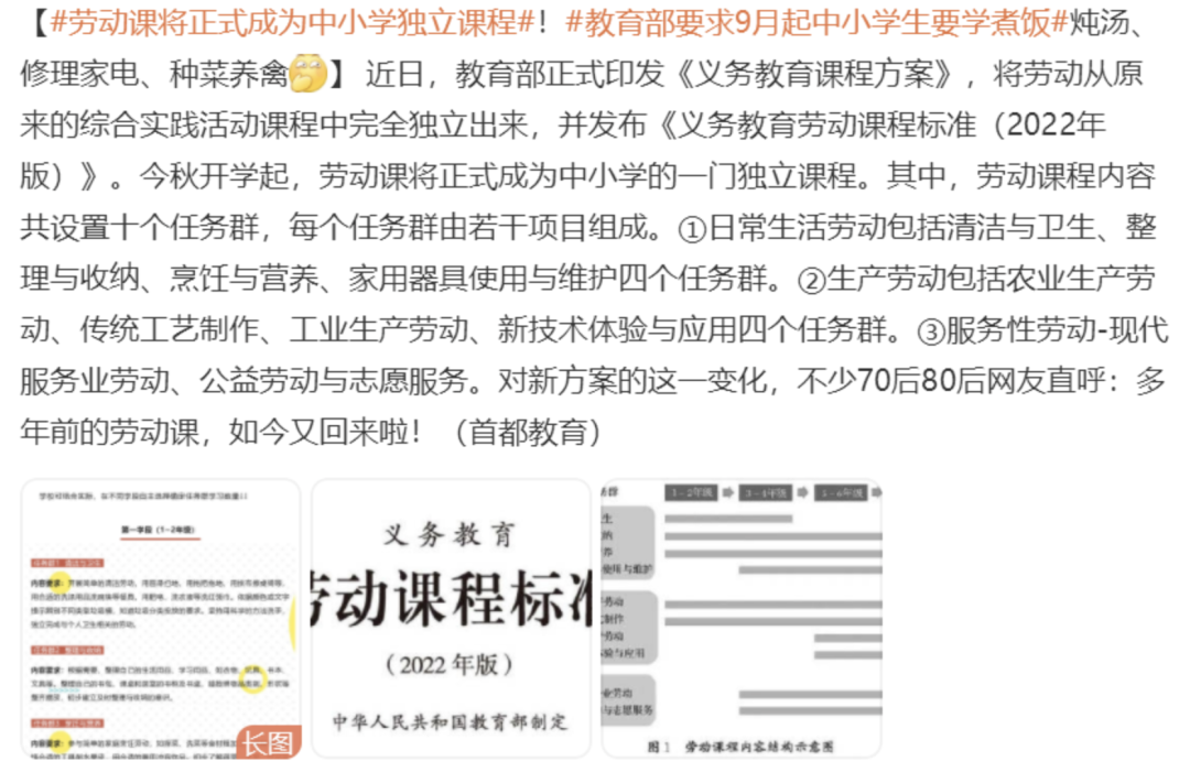 教育部发文将劳动课正式纳入中小学成为独立课程,这个信息直接冲上了热搜榜单成为第一热搜: