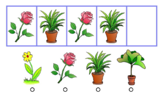 在道题中,从左往右是按照一朵玫瑰,一盆植物这样的规律间隔排列的,所以我们可以很容易找到答案是第二个选项。
