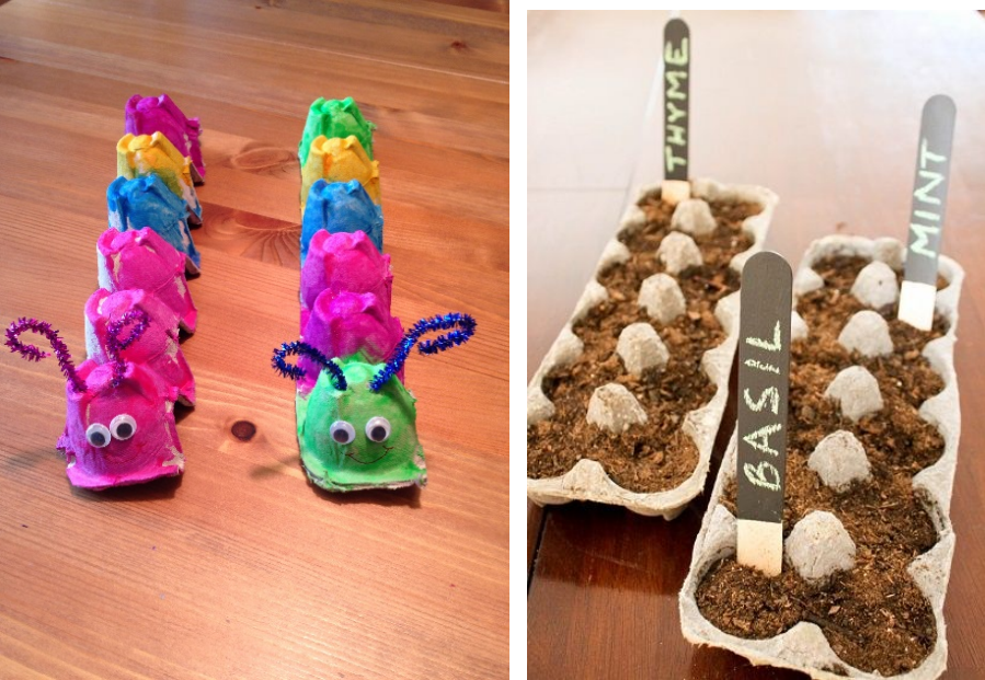 (图为利用鸡蛋盒制作的毛毛虫手工和植物种植实验)