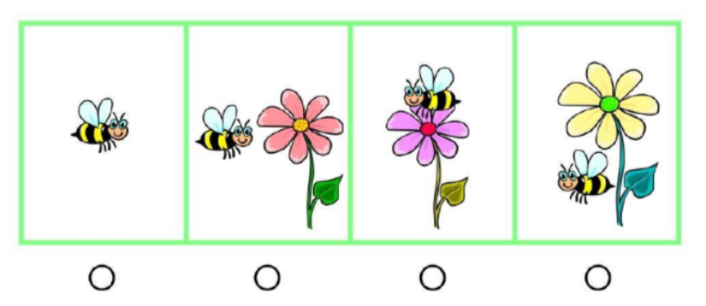 这种试题就和我们国内的英语听力题差不多。比如这道题,孩子需要知道蜜蜂和花朵的英文怎么说,另外就是每张图中两者的位置关系应该是什么。