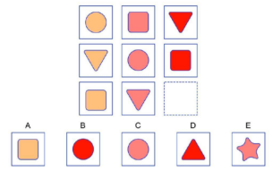 第三道题需要孩子发现图形的规律。我们可以看到,每一行和每一列都会有圆圈,方形,三角形,每一列的颜色是一样的。根据这样的规律我们可以判断,最后一列缺失的图形是圆形,颜色是红色,所以选第二个。
