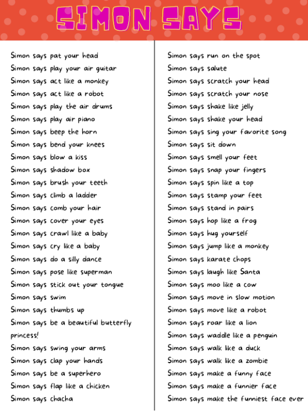 Burns, C. (2019, September 18). 101 Awesome Simon Says Ideas (And How to Play!). Retrieved from Big Happy Backyard: https://bighappybackyard.com/simon-says-ideas/