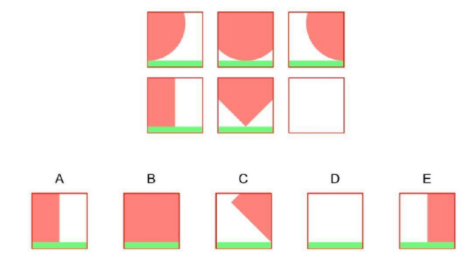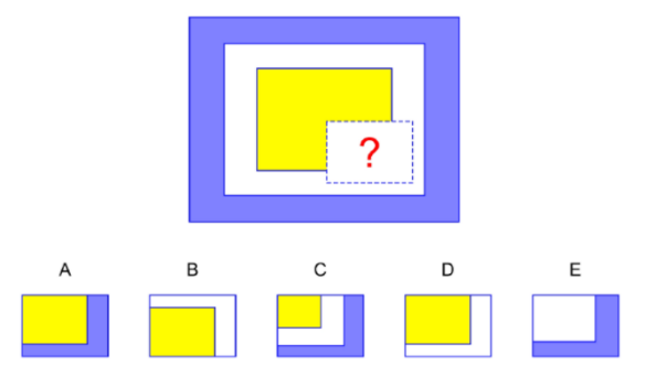 这道题的答案是D。我们看到虚线部分只是盖住了部分黄色和白色的区域,而没有覆盖到蓝色区域,所以可以排除A, C, E。由图形的形状构成,我们预测被覆盖的黄色区域应该是长方形的右下角,由此可以判断选择D。
