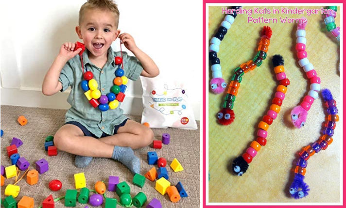 我们可以尽情地发挥想象力,按照珠子的颜色,形状,尺寸,再混合上数字和字母,来编造各种规律的排列让孩子去发现。