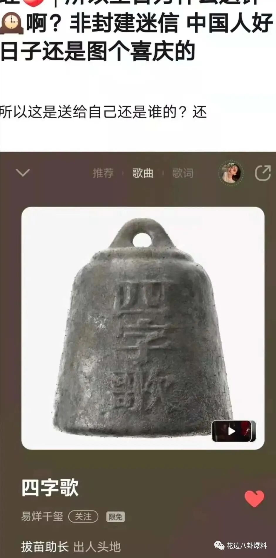 四字易烊千玺的新歌封面,虽然或许、可能长得有一点像一口钟,不仔细看的确像。但是,咱们仔细看一看,就可以很清楚地看出来它其实是一个秤砣。有着老干部之称的四字易烊千玺,之所以被称为老干部,还不是因为他喜欢文玩。