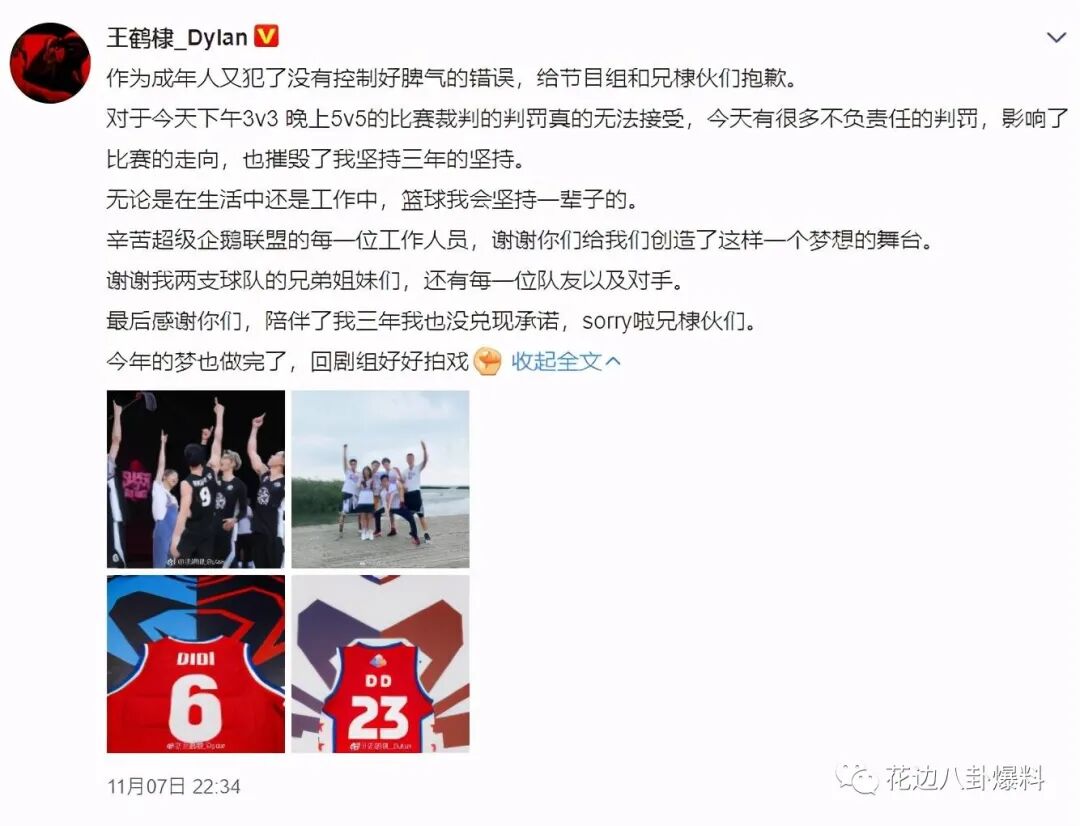 可道歉虽然道了,但字里行间还是能看出来王鹤棣想要“狡辩”的态度:“很多不负责任的判罚”这句,既像是在“卖惨”、诉苦自己的“坚持”被摧毁;又是为了找补自己“是因为判罚不公正所以才爆粗口”~