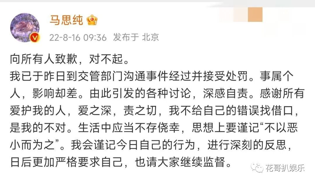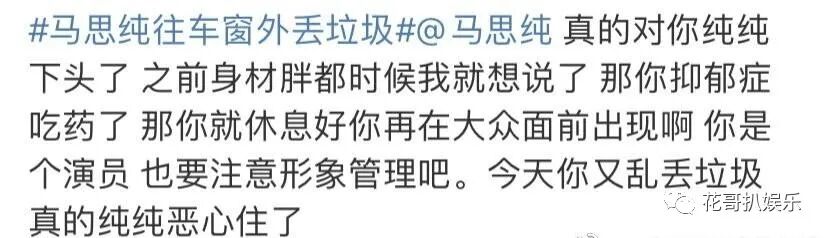 在此针对整件事情,花哥想说,其实娱乐圈很多艺人都挺没素质的,毕竟平常被周围的人捧着,脾气也变得越来越大。即使做错了事情,身边的人也不敢指出来,这样时间久了,这些明星艺人们也越来越傲慢,就算做错了事情,他们也只认为是件小事,没什么大不了的。毕竟自己可是“人上人”,马思纯不是头一例,也绝不会是最后一例。