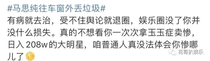 随之而来的自然就是网友们的各种谴责了,毕竟马思纯做的事已经实锤了。令人无语的是,她的粉丝在疯狂洗白。粉丝们明目张胆转移话题,借着抑郁症疯狂卖惨博同情。