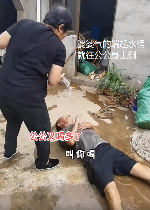 这会女子与婆婆一直在旁边看着,婆婆见状直接搬起了水桶,对着公公的头部就浇了下去,一边浇一边气狠狠地说道:叫你喝,这回叫你喝个够。