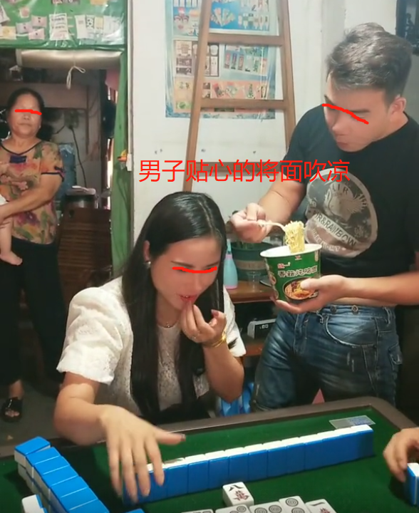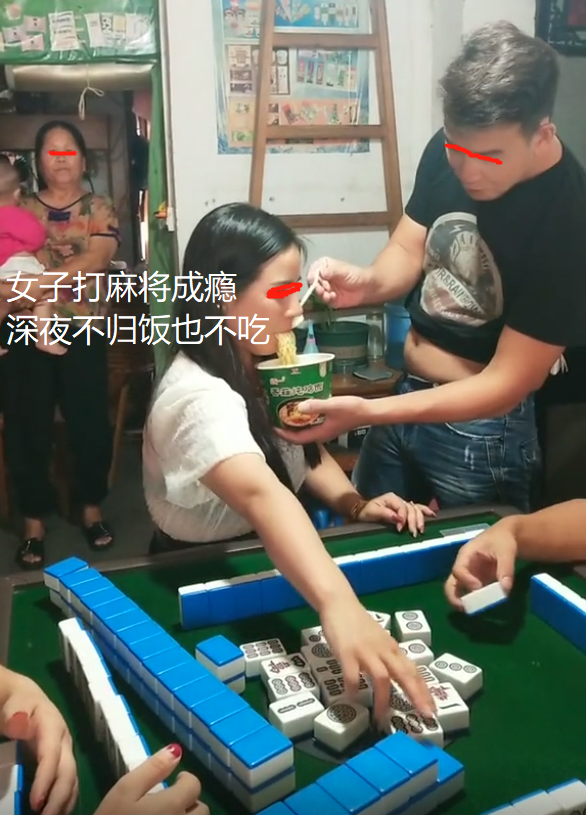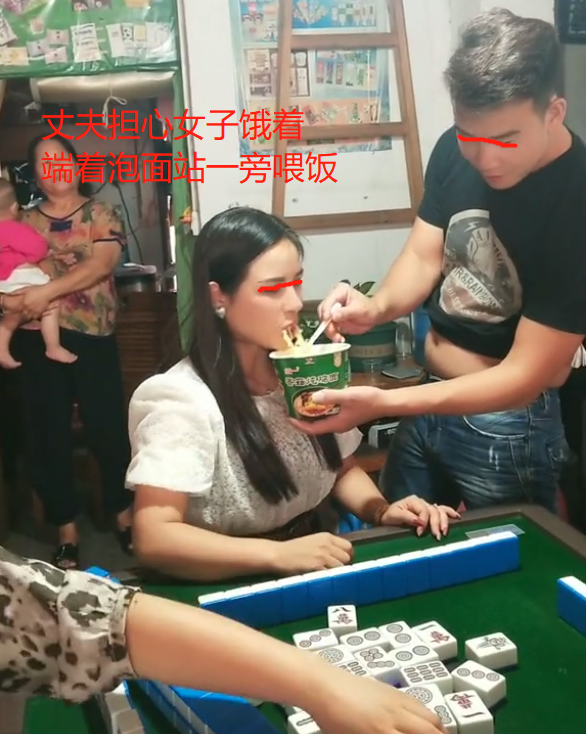 丈夫在得知这一情况之后心疼得不得了,连忙带着一些吃的找到了女子,可是女子只顾着打麻将,又怎么会停下手中的动作去吃饭呢?