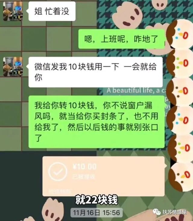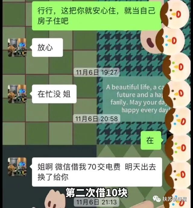 女子自述是11月初发现不对劲的,租客跟她说经济困难,正好借点钱交电费,十块二十块都开口,女子好心全部都借给他。