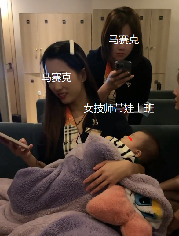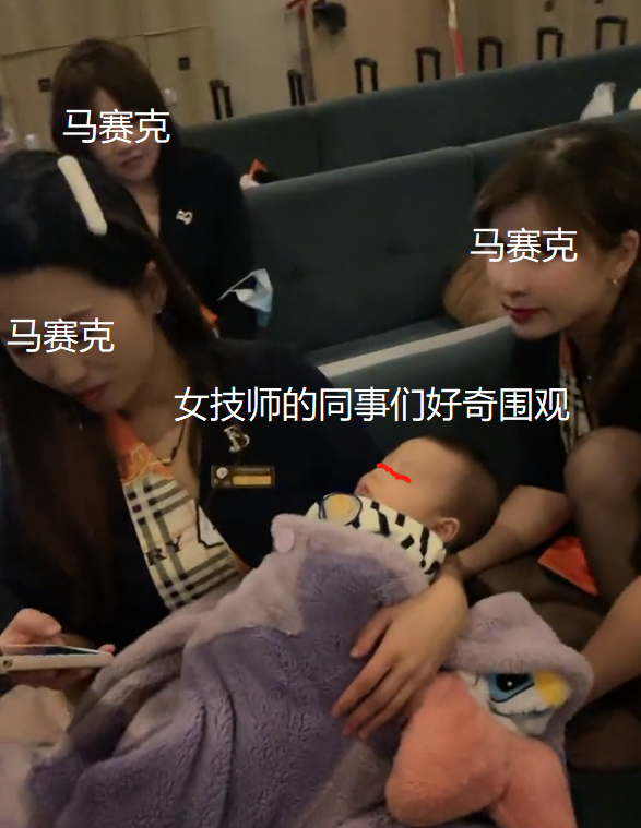 而这位女技师就一直抱着孩子坐在狭窄的卡座上等待顾客的点单,一些好奇的小姐妹,也是饶有兴趣的上前查看。
