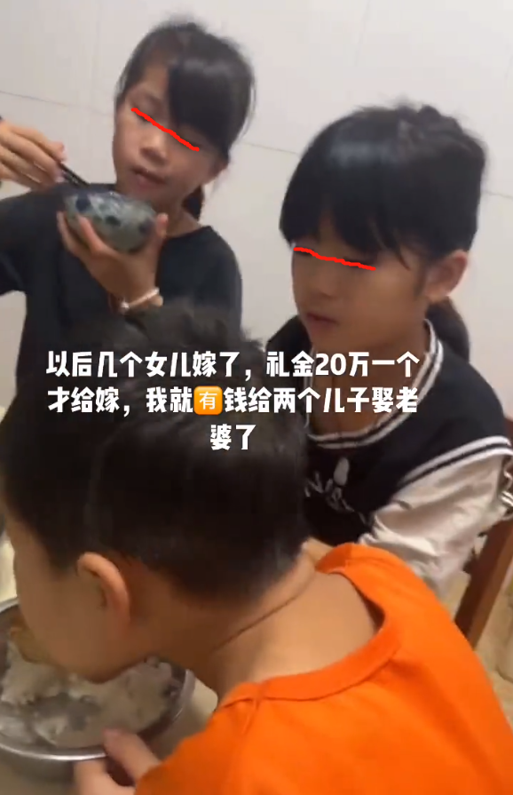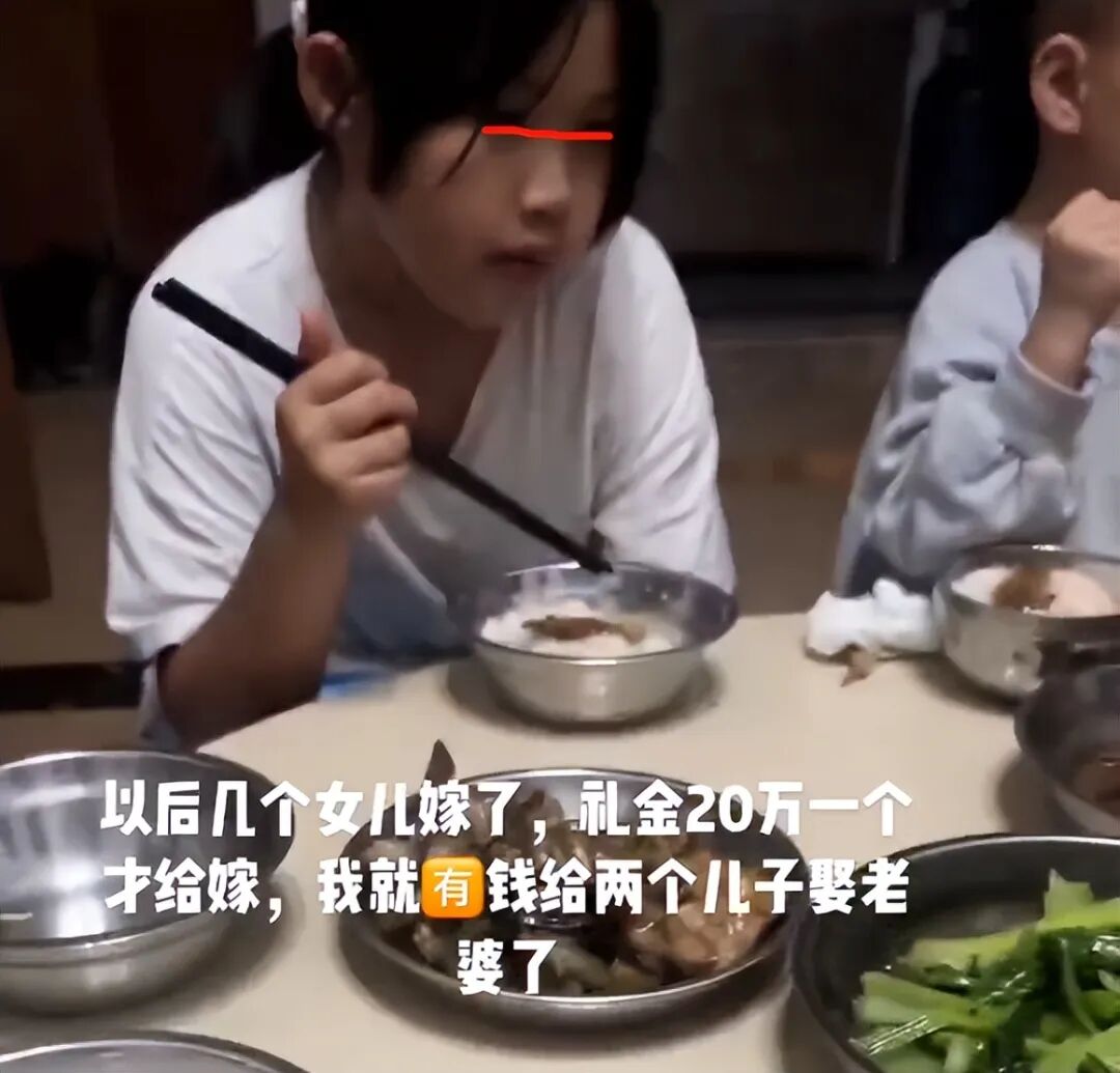 这一天,女子和孩子正在吃饭,随手就拿起手机将这一幕记录下来,并直言声称表示虽然现在自己抚养这么多的孩子很辛苦,压力也很大,可等到孩子们都大了,自己定然会享福的,而且到时候这几个女儿每个人都要20万的彩礼,这样就能够给两个儿子娶老婆了。