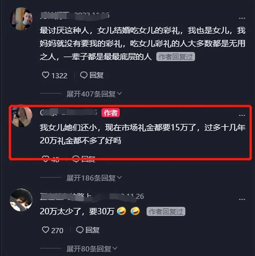 这样的想法和观念,瞬间就引发了不少网友的怒火,直言表示难道养女儿就是为了要彩礼给儿子娶媳妇的吗?难道女儿就不是自己的孩子吗?