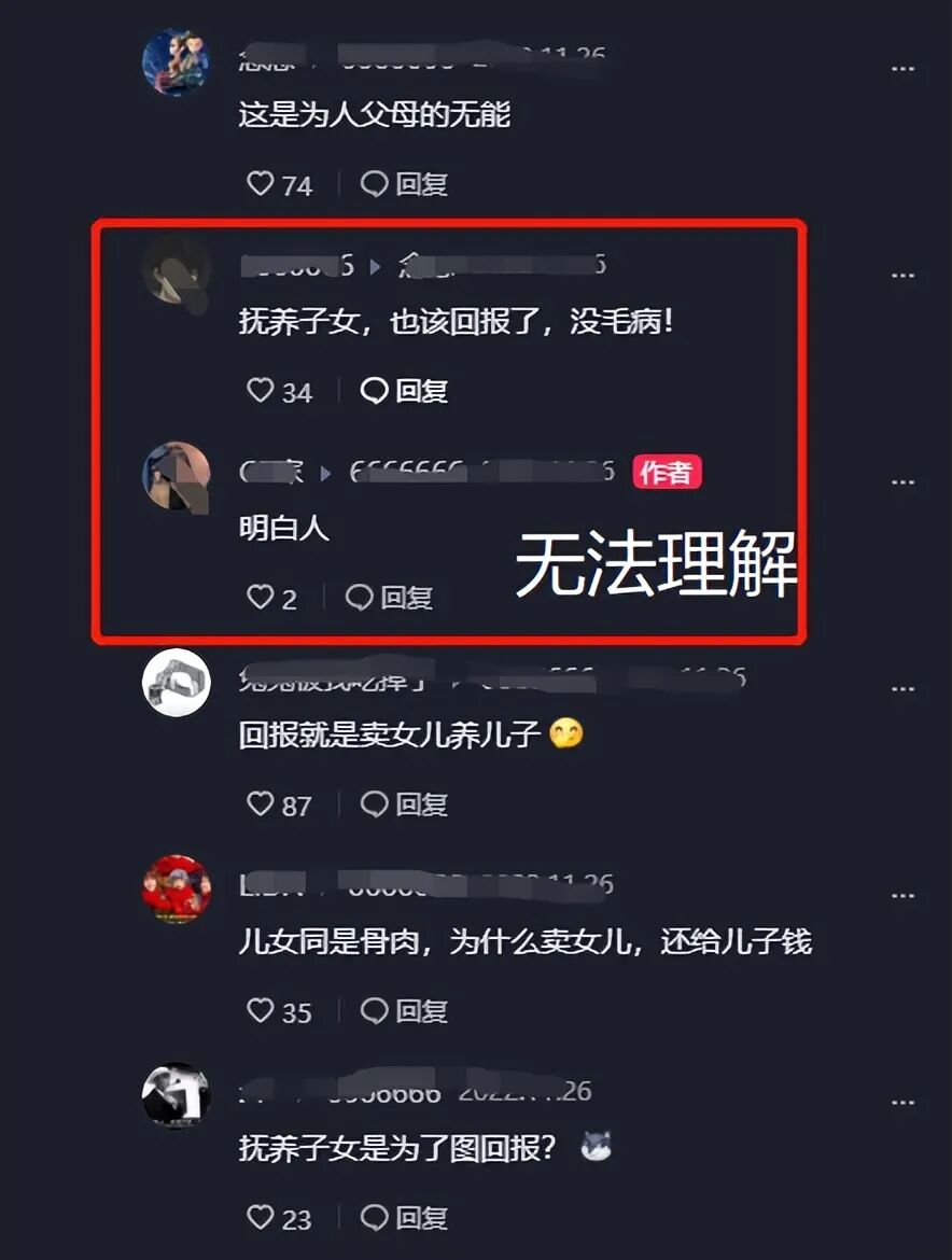 那么既然要回报,儿子的回报又在哪里呢?女儿养大不容易,难道儿子就能喝风长大吗?娶妻结婚这些钱,难道还要拿女儿当做筹码去换吗?