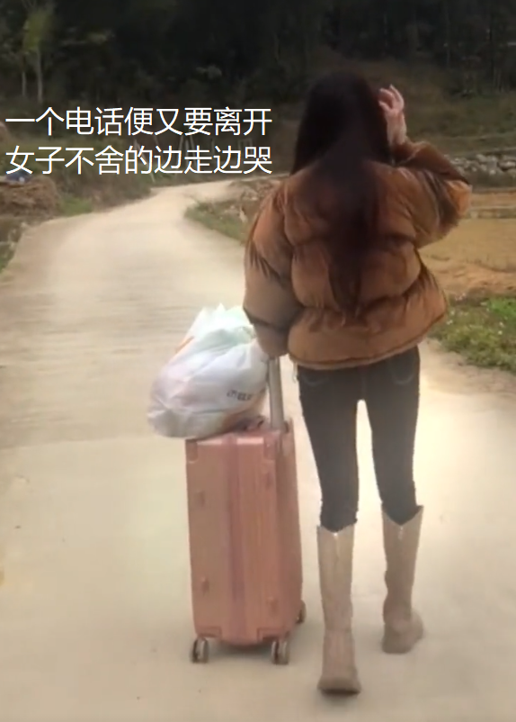 本以为临近年关,回来的妻子会和自己在家过年,可殊不知仅仅一个电话,就让妻子急匆匆的收拾好行李再度踏上打工的旅程,望着妻子一个人拖着行李渐渐远去的背影,男子心中也是十分的心疼,暗自发誓一定要在家照顾好家人,不给妻子添麻烦。