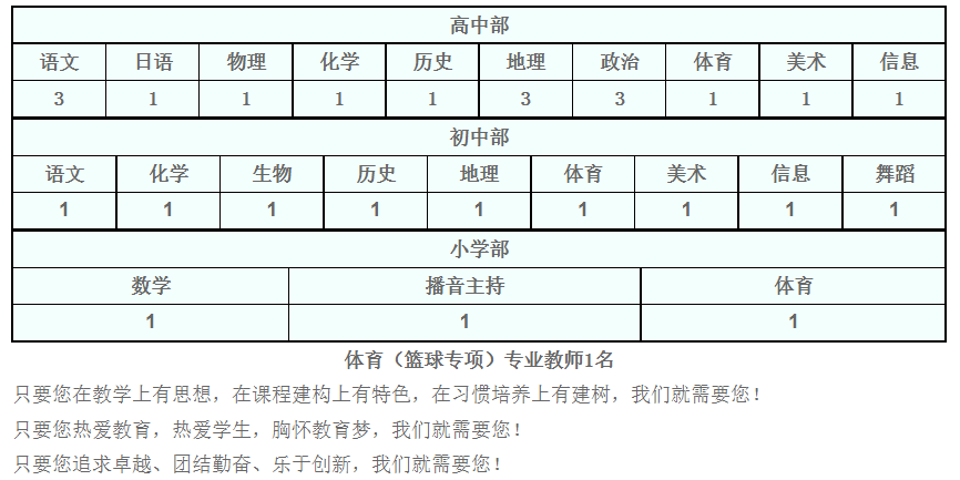 3.体育(篮球专项)教师身高185cm以上,参加过州级、省级比赛并获得荣誉称号者优先。