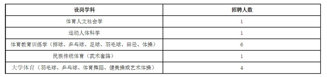 备注:表中学科方向为设岗方向,非应聘者所学专业。要求应聘人员的专业为体育相关专业,与设岗学科方向相同或相近。运动康复和运动医学以及医学相关专业的应聘人员亦可申报运动人体科学专业岗位。