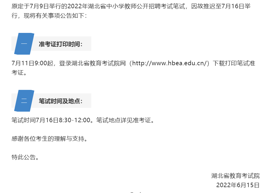 2022湖北教师统招笔试时间推迟至7月16日